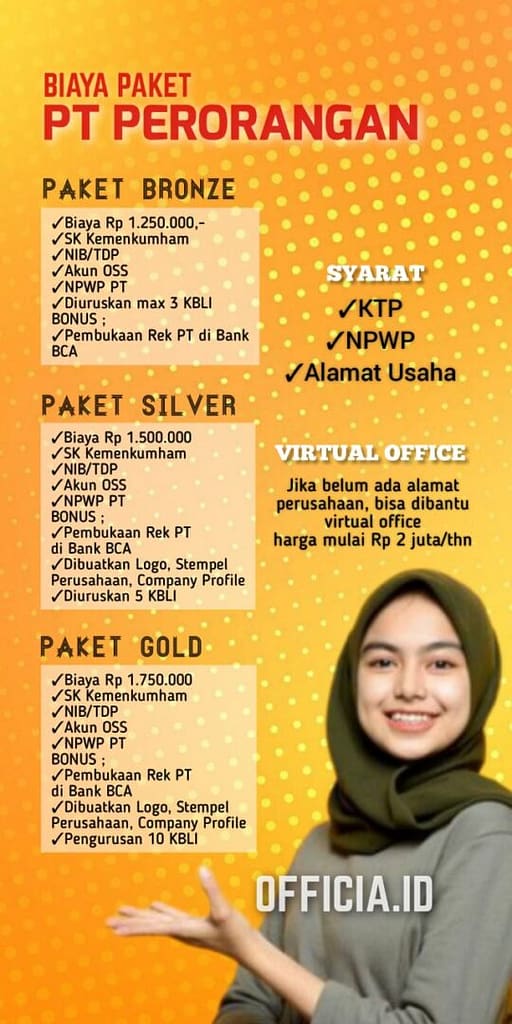 Officia.id adalah perusahaan yang menangani legalitas izin pendirian CV, PT dan Yayasan Perorangan, yaitu badan usaha berbentuk perseroan terbatas yang didirikan oleh satu orang.
